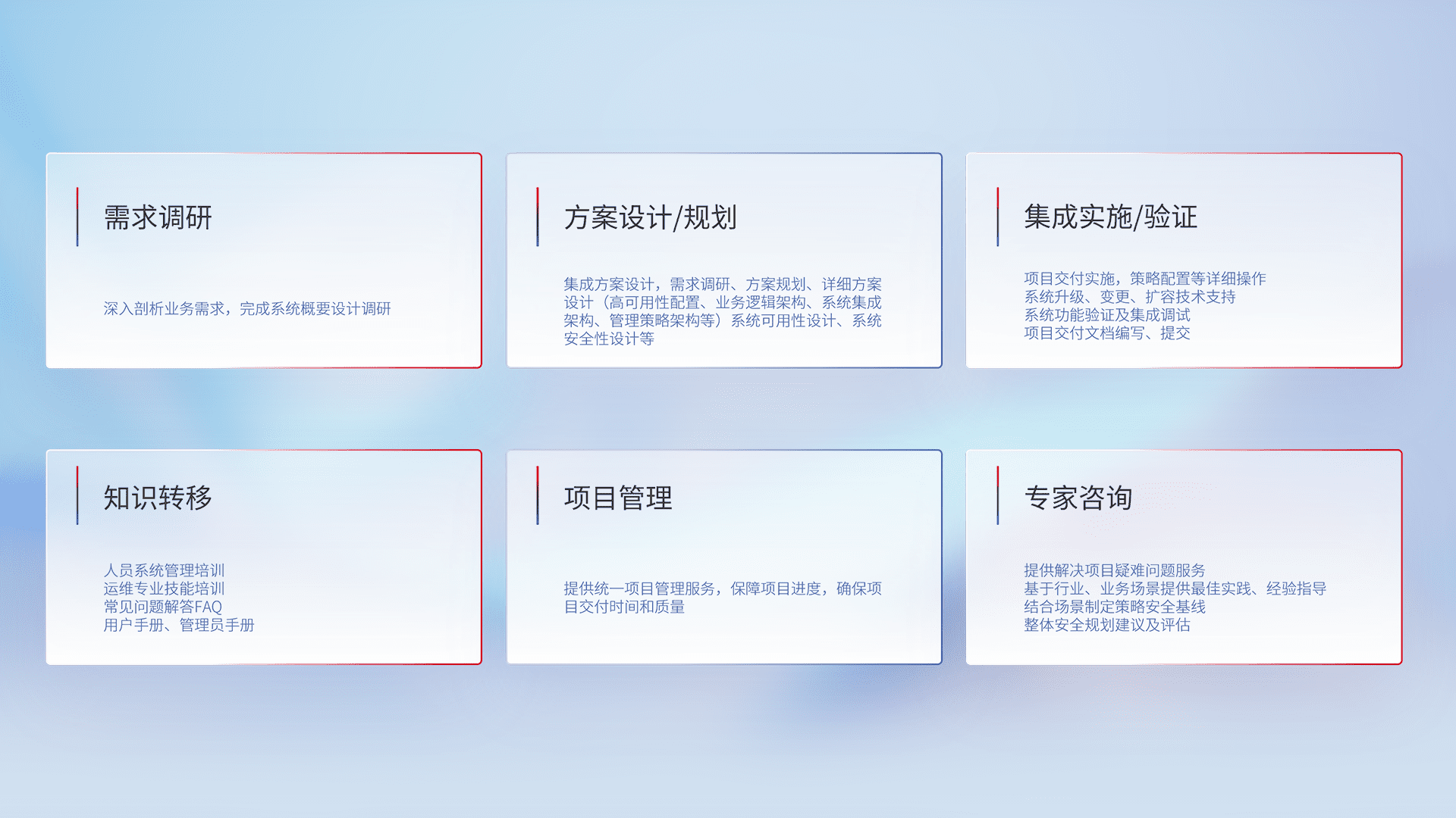 针对客户行业特性,,,,将宏观的安全战略和需求,,,,通过专业的交付服务,,,,实现项目落地,,,,为客户提供标准规范的集成交付服务。。。